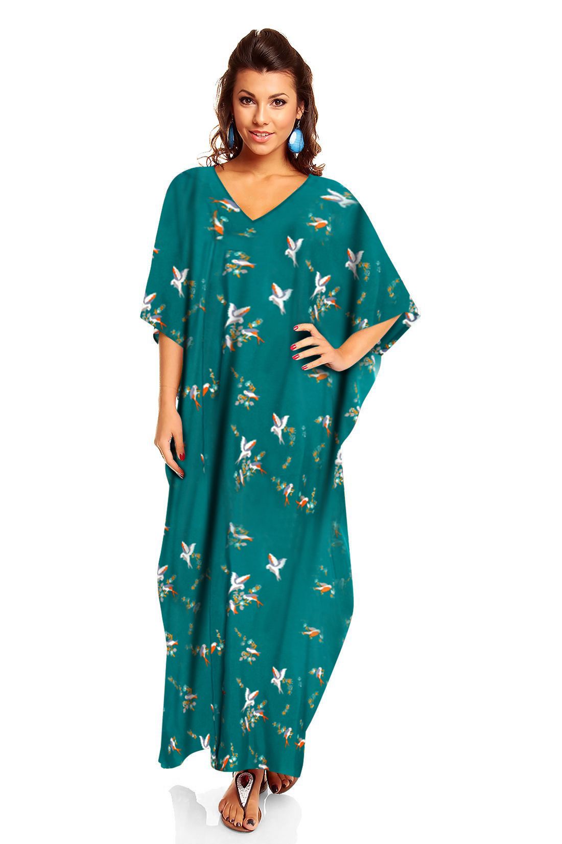 Ladies Full Length Maxi Kaftan Dress in Teal Swallow Bird Print